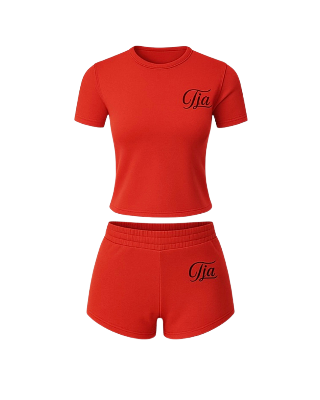 This bold 2-piece set from TJA features a form-fitting short-sleeve top and high-waisted shorts designed for comfort, movement, and serious heat. With our signature embroidery stitched clean on both the chest and thigh, this set is made to flex—whether you’re lounging or on the go.