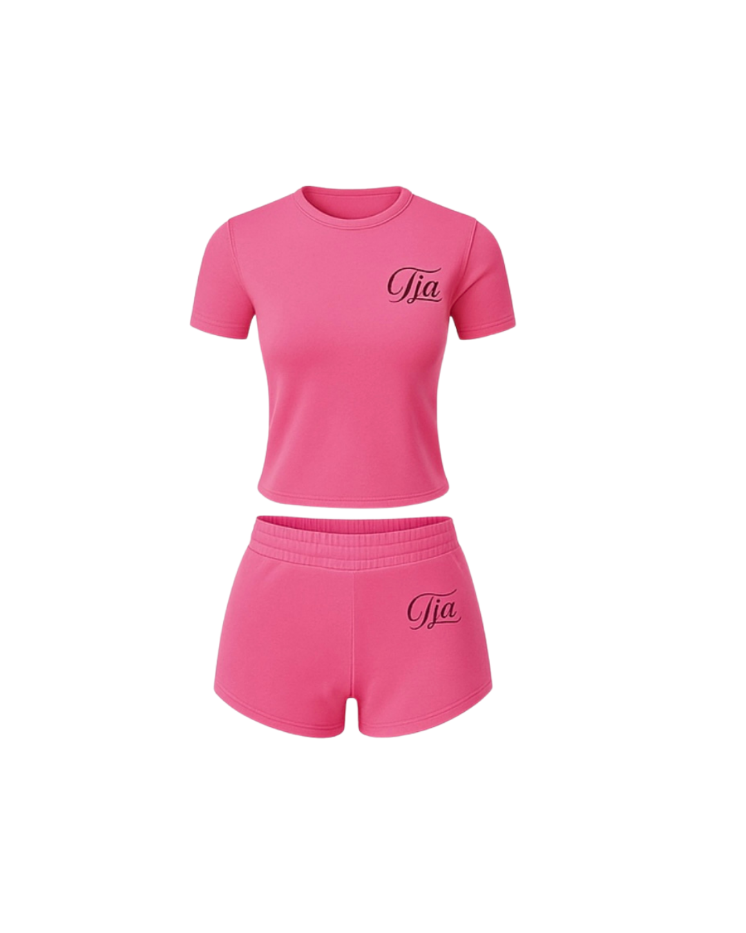 This bold 2-piece set from TJA features a form-fitting short-sleeve top and high-waisted shorts designed for comfort, movement, and serious heat. With our signature embroidery stitched clean on both the chest and thigh, this set is made to flex—whether you’re lounging or on the go.